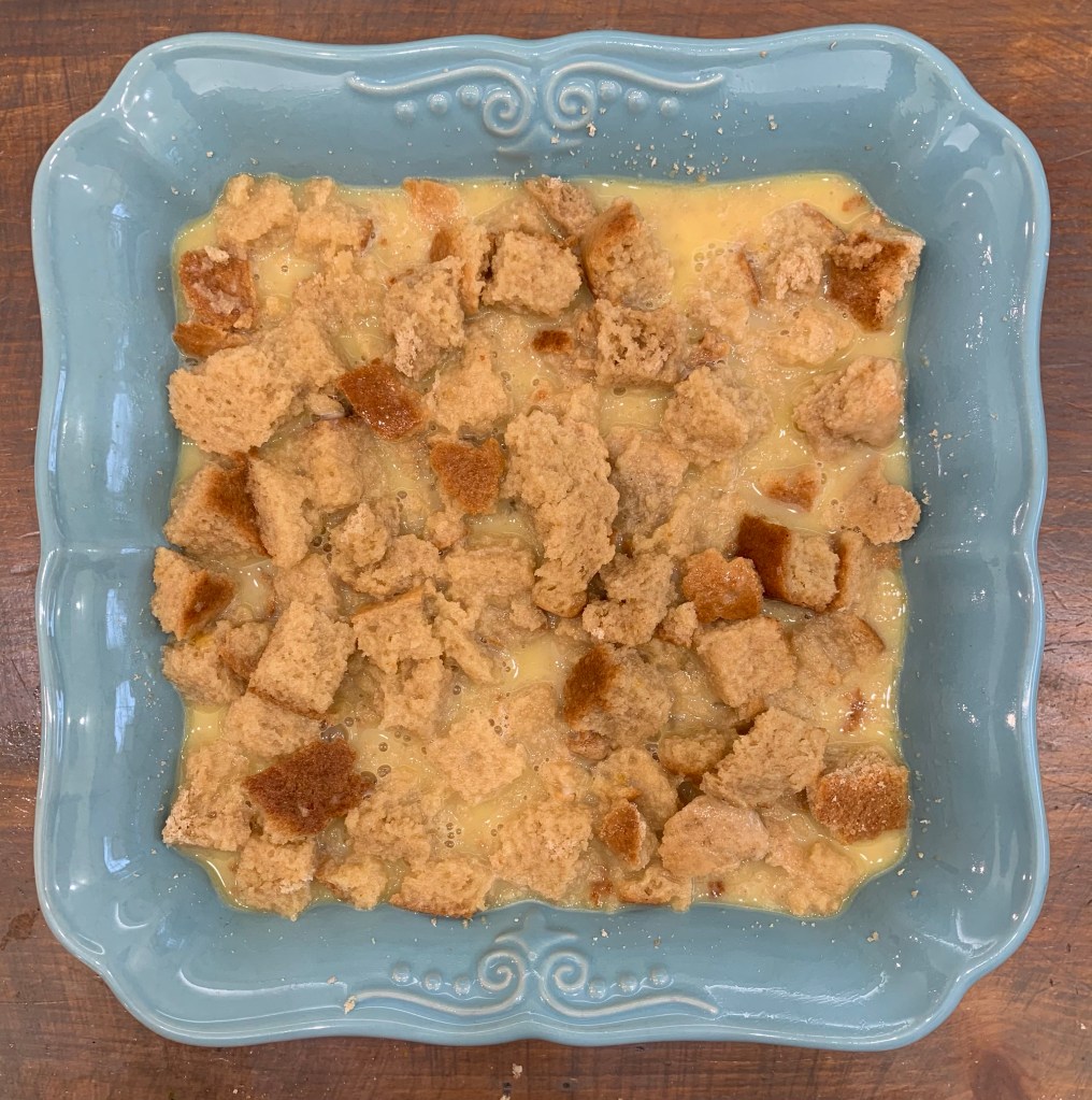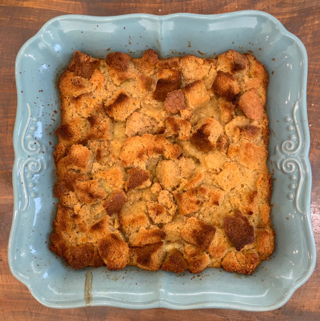 I’d made rice pudding last week and so after searching for recipes for bread pudding, I combined some of them with some of what I did for the rice pudding. Here’s the finished product.
